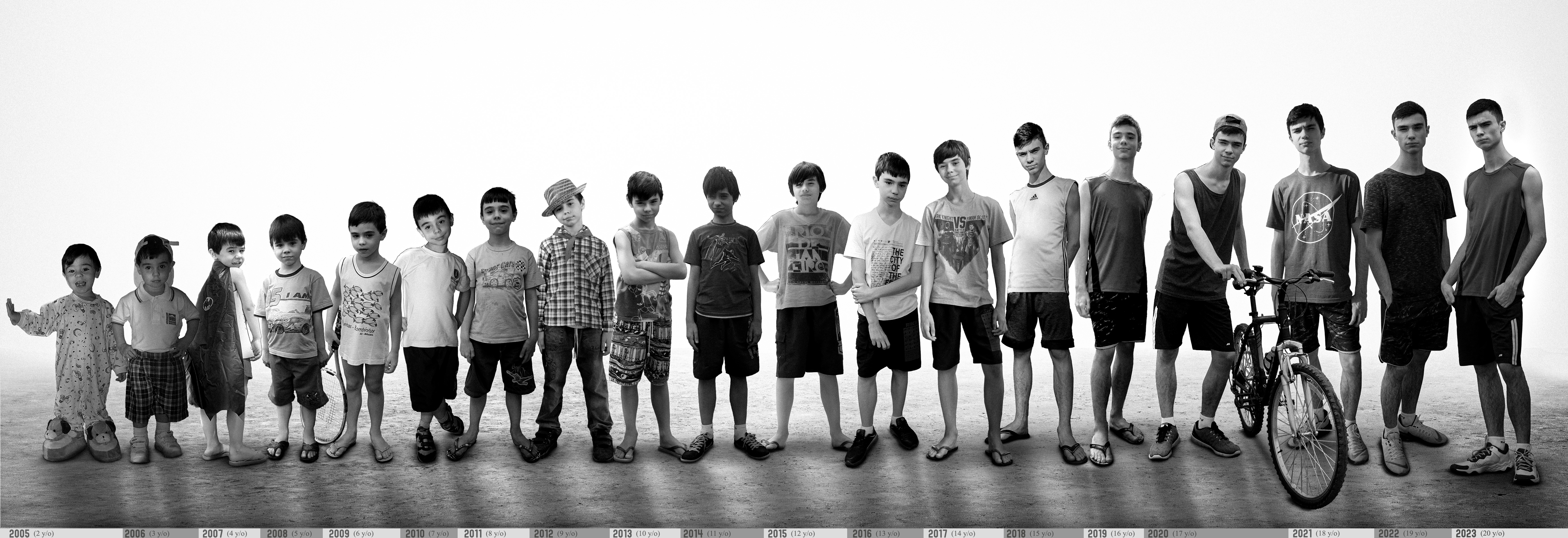 - Nos últimos anos da imagem, entre os 18 e 20 anos, o menino agora é um jovem adulto, visivelmente mais alto e com um físico esguio. Em uma das fotos, ele está ao lado de uma bicicleta, simbolizando sua transição para a idade adulta e maior independência.